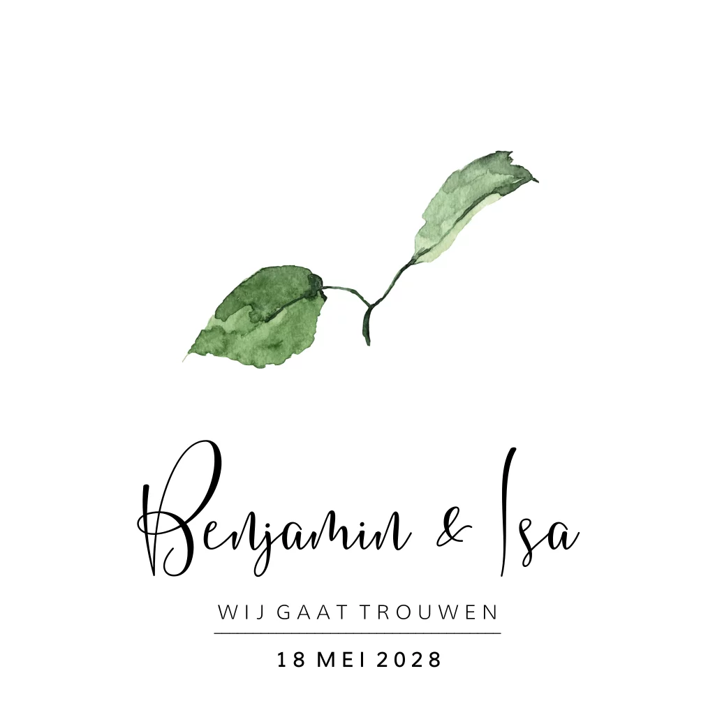 Prachtige enkele vierkante trouwkaart voor jullie huwelijk. Met prachtige sierletters en subtiel een botanisch blaadje. Alles staat los en er zijn nog veel meer blaadjes in onze beeldbank. Probeer het uit!