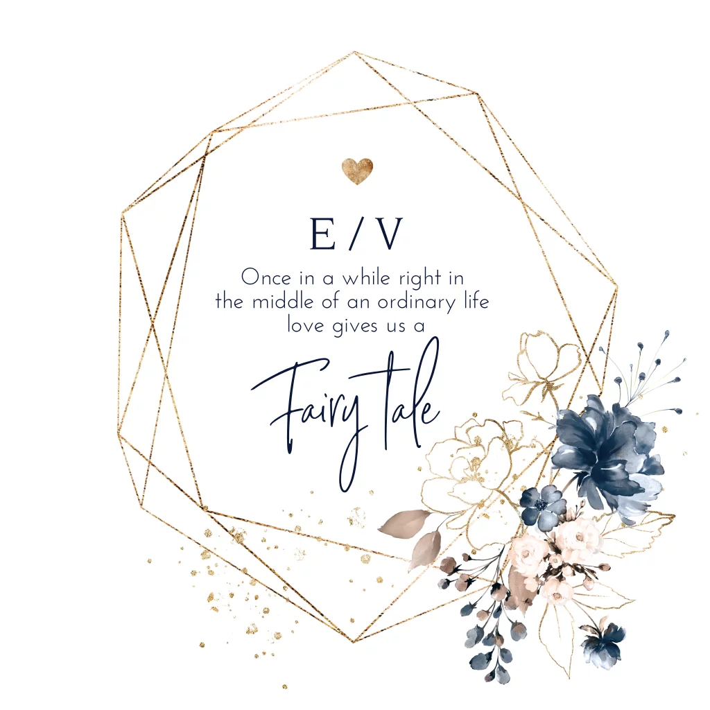 Enkele vierkante romantische Save the date kaart met goud gekleurde geo vormen en bloemen. Versierd met jullie initialen en een liefdes gedicht. Alles staat los en is te bewerken.