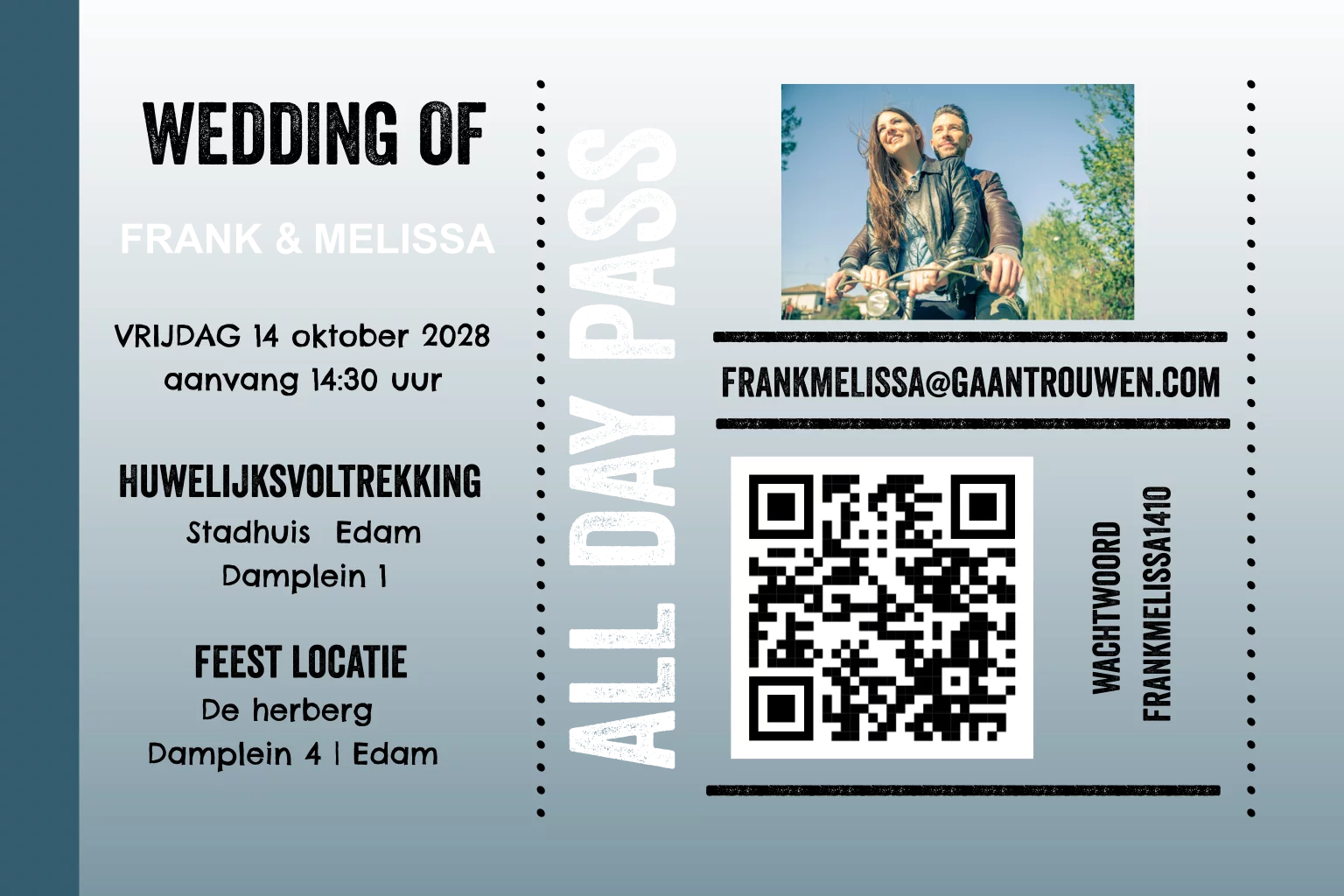 Stoere trouwkaart met festival of ticket als thema. Met ruimte voor qr code. Met goudfolie en de blauwe kleur kan je aanpassen.
