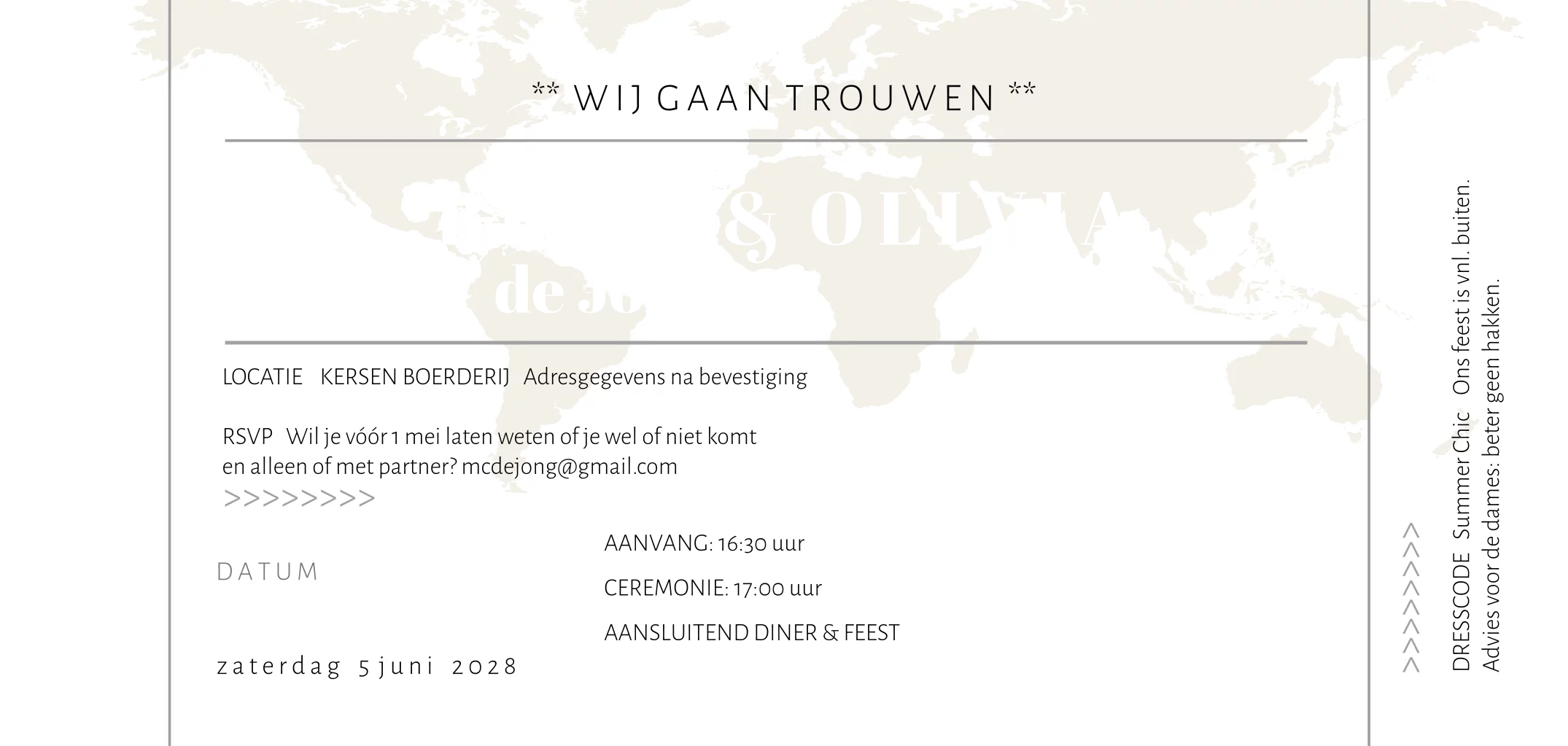 Trouwkaart in de vorm van een boarding pass. Met lijnspel, beige tinten en goudfolie.