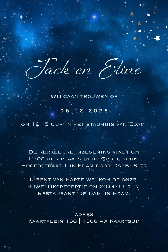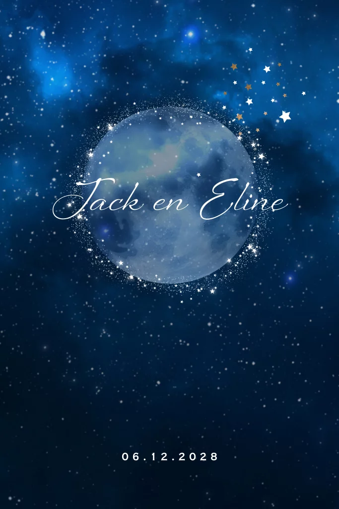 Opzoek naar een romantiche trouwkaart? Met donker blauwe sterrenhemel ondergrond en maan. De maan staat los en kan verplaatst, vergroot of verkleint, Zelf maken!