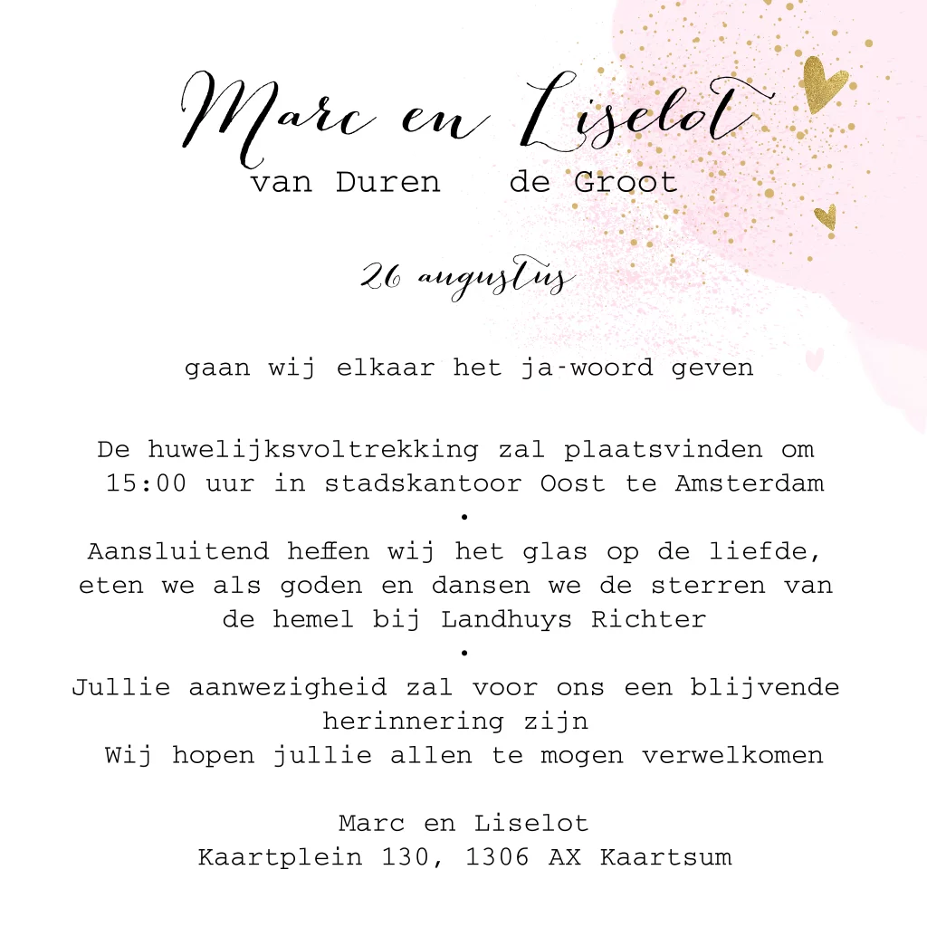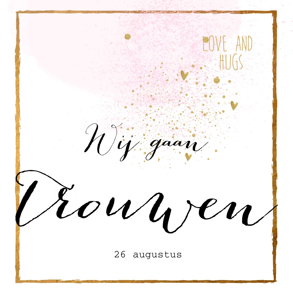 Pastel tint trouwkaart met watercolor en gouden glitter hartjes