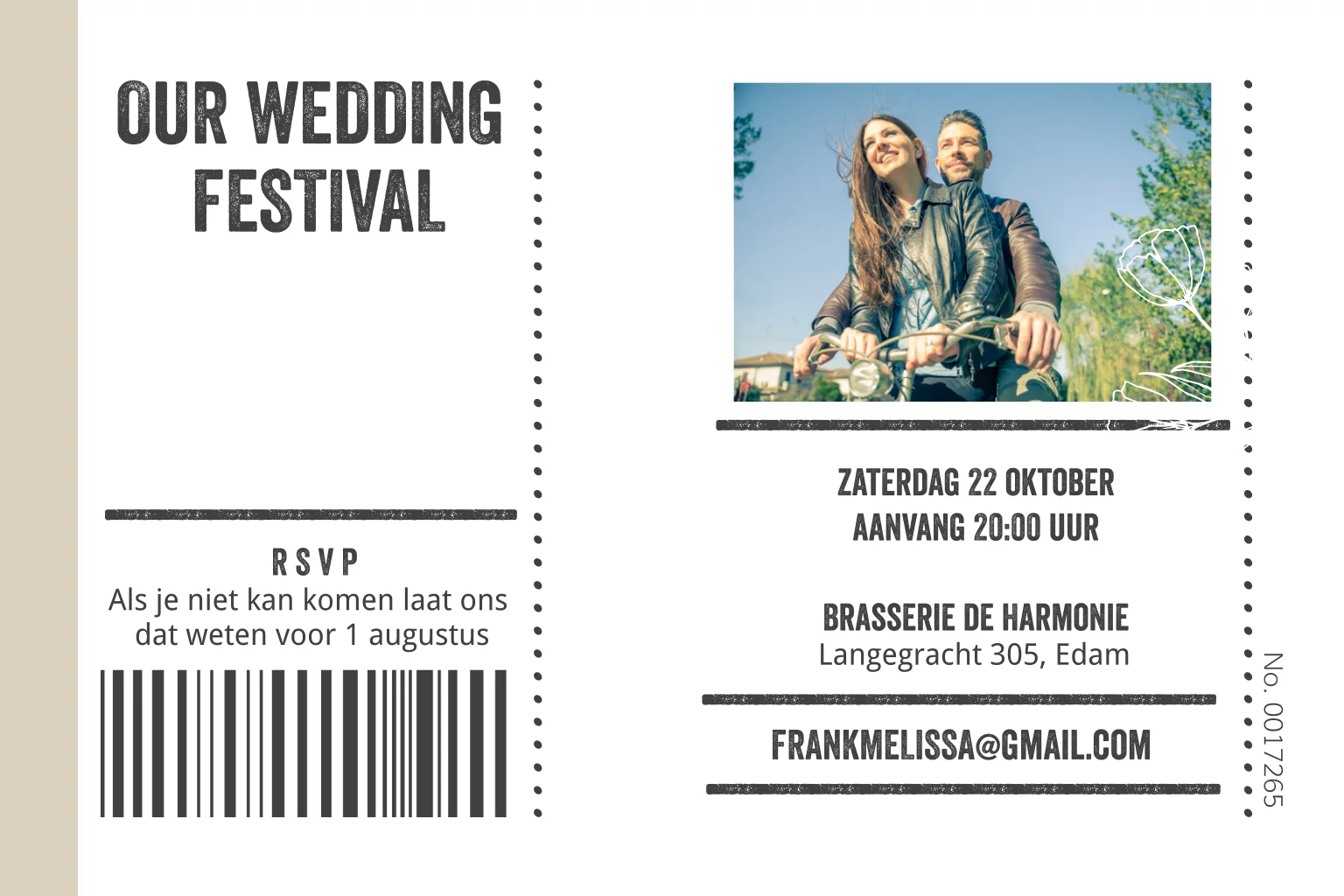 Trouwkaart ticket stijl met goudfolie en foto ruimte.