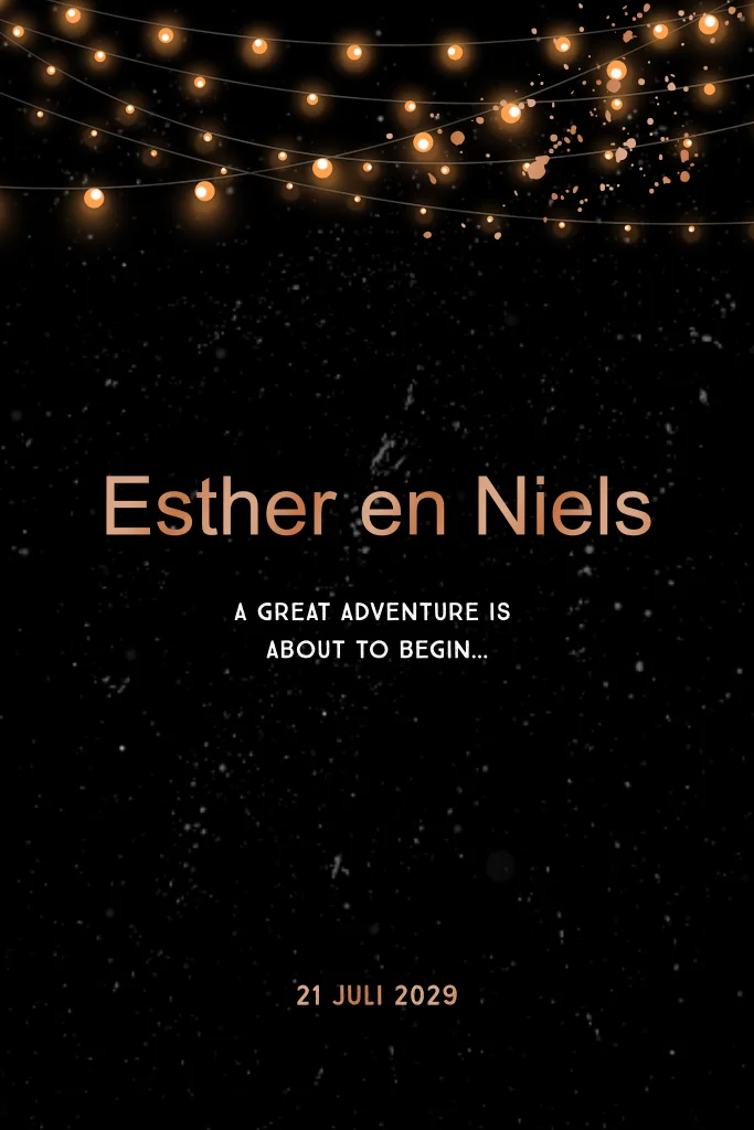 Romantische avond trouwkaart met donkere ondergrond feestelijke slinger lampjes.
