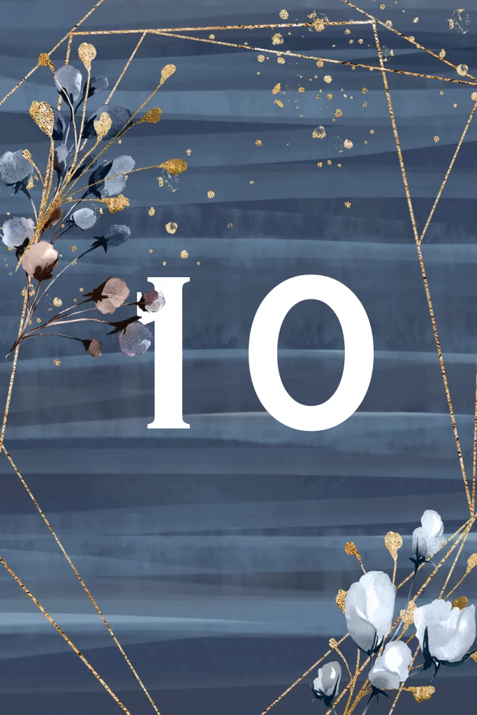 Passende tafelnummer kaart met donkerblauwe navy blue watercolor brush en roze met bloemen en goudlook poeder look. Zelf maken.