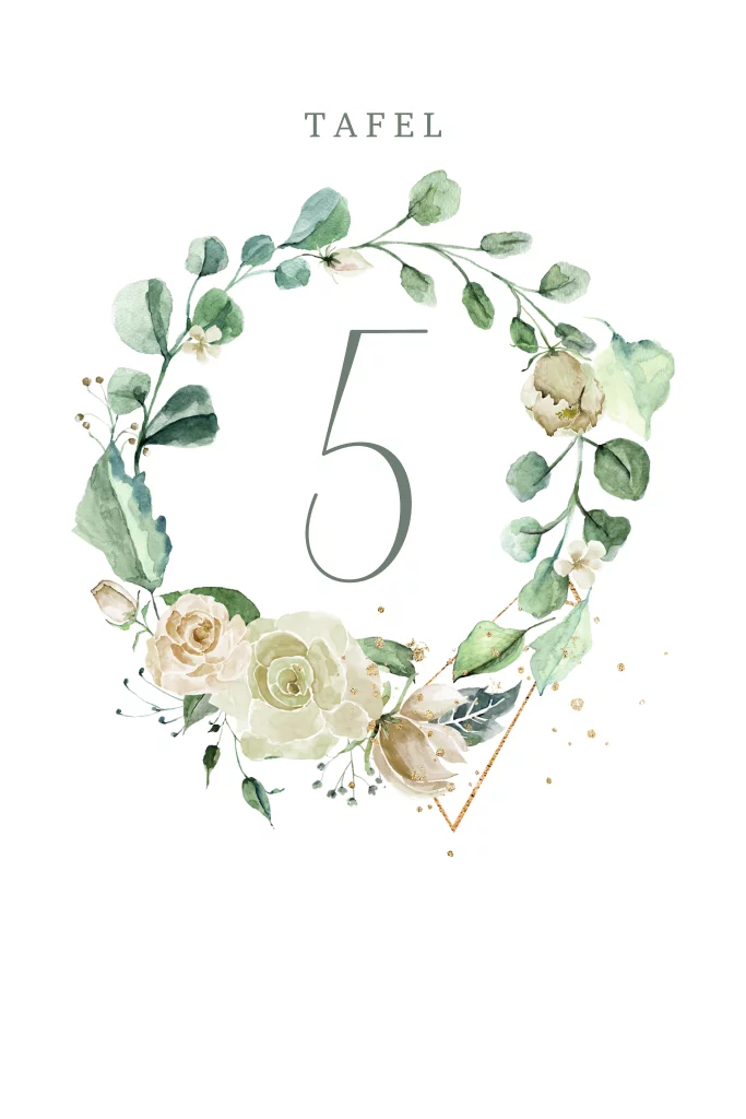 Passende tafelnummer kaart trouwen met witte rozen watercolor krans. Met goudlook spetters en geovorm. Zelf maken.