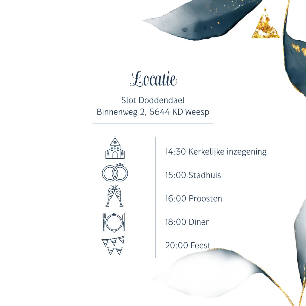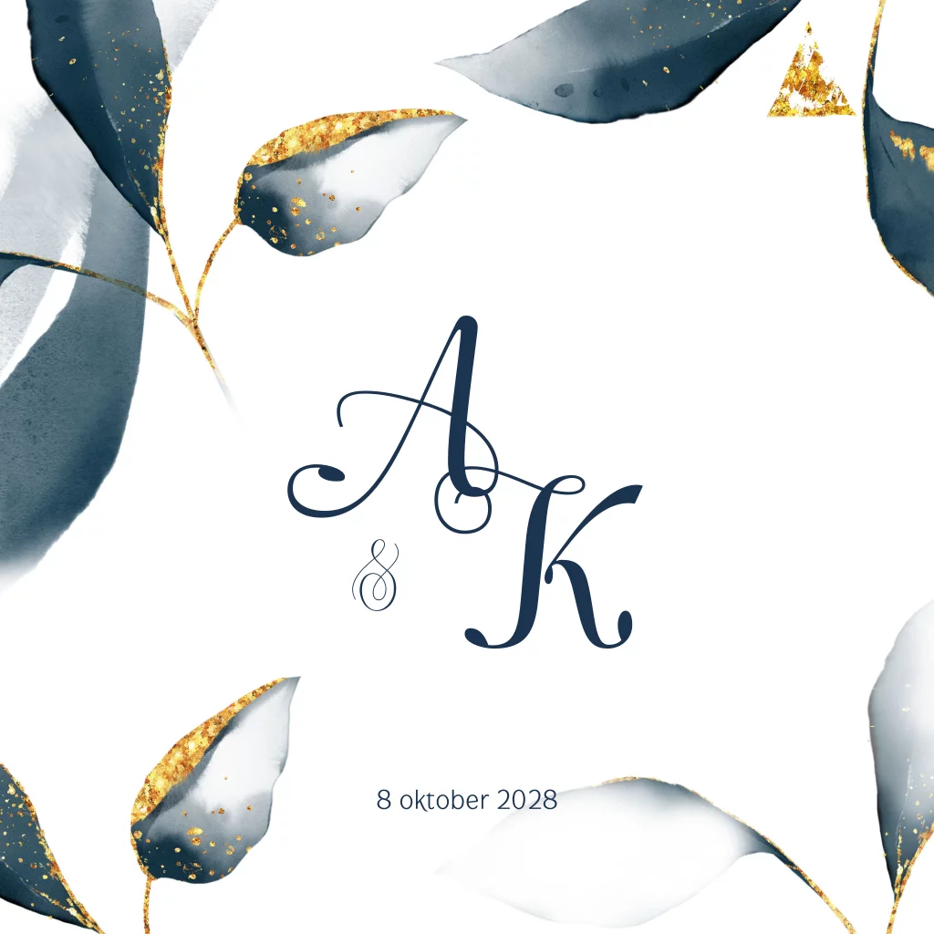 Prachtige uitnodiging voor jullie huwelijksfeest? Met groen blauwe bladeren met goud kleur. Alles staat los!