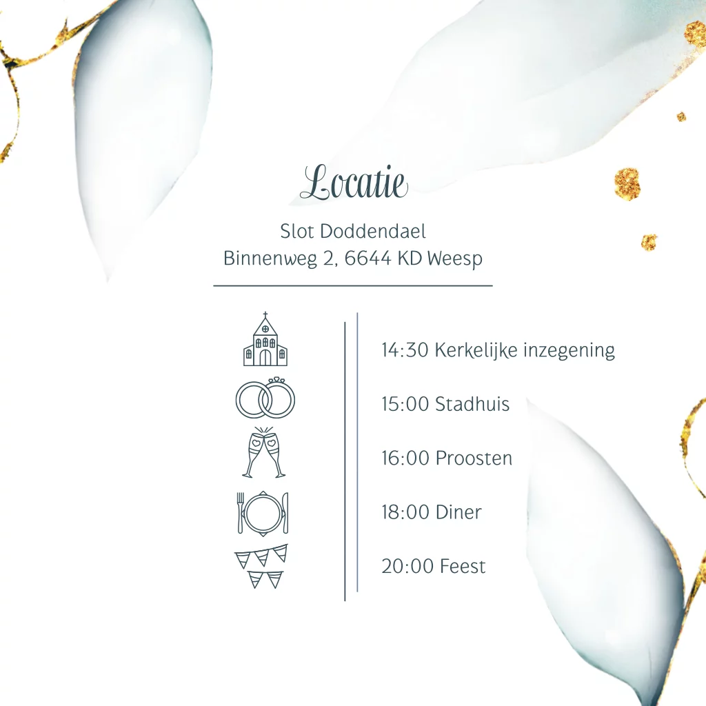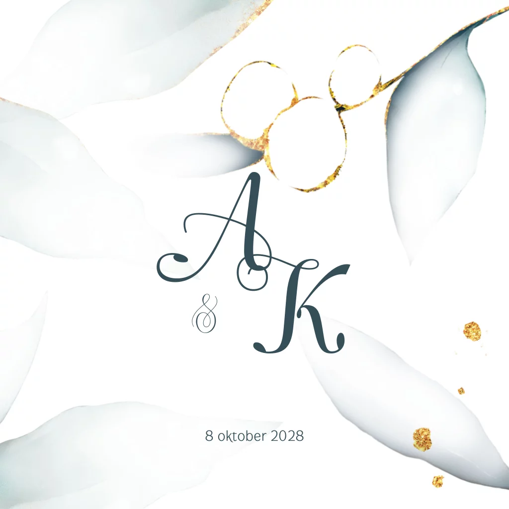Prachtige uitnodiging voor jullie huwelijksfeest? Met zacht groene bladeren met goud kleur. Alles staat los!
