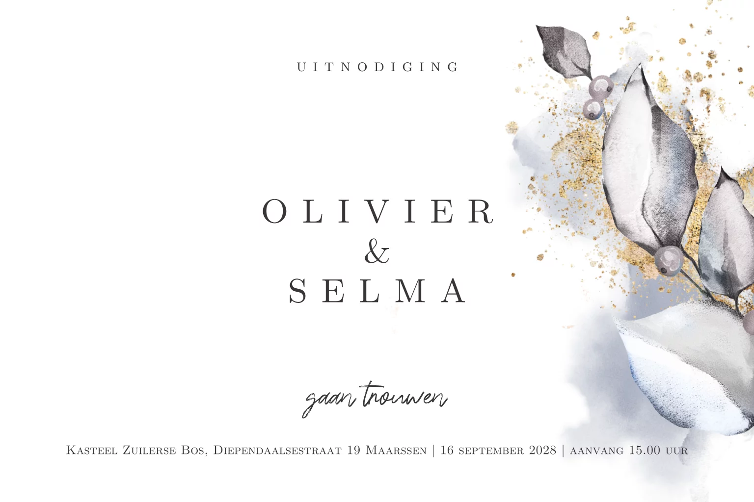 Stijlvolle sunset flowers liggende trouwkaart met lila kleur takje en watercolor goudlook brush. Zelf maken!