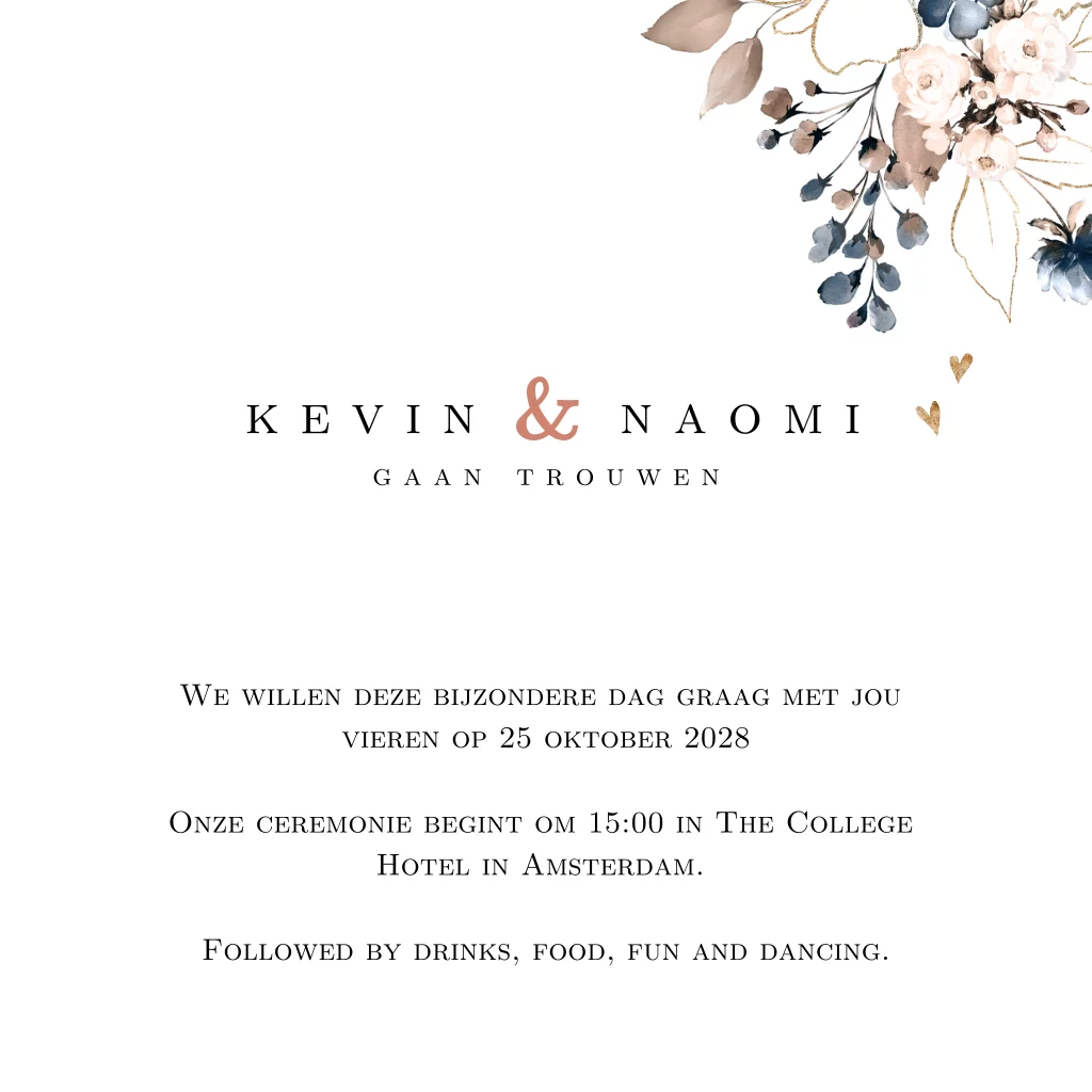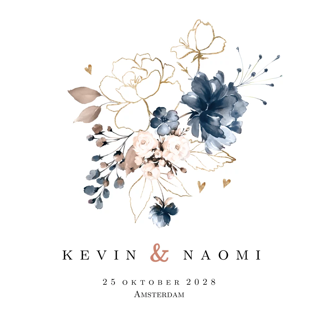 Vierkante dubbele trouwkaart met chique navy blue aquarel en goudkleurige bloemen (geen echt goud). Zelf maken.