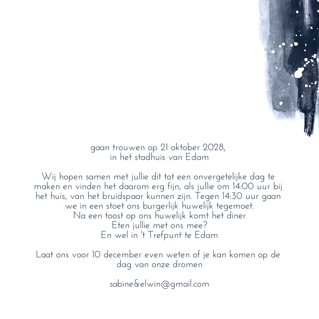 Chique uitnodiging voor jullie huwelijk? Met navy bleu, donkerblauwe verf ondergrond met fijne hartjes en prachtig goudfolie gekleurde kwast spetter effect. Alles staat los!