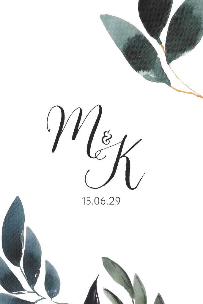 Opzoek naar een stijlvolle romantic chic trouwkaart? Met groene en blauwe watercolor bladgroen op en witte ondergrond. Zelf maken!
