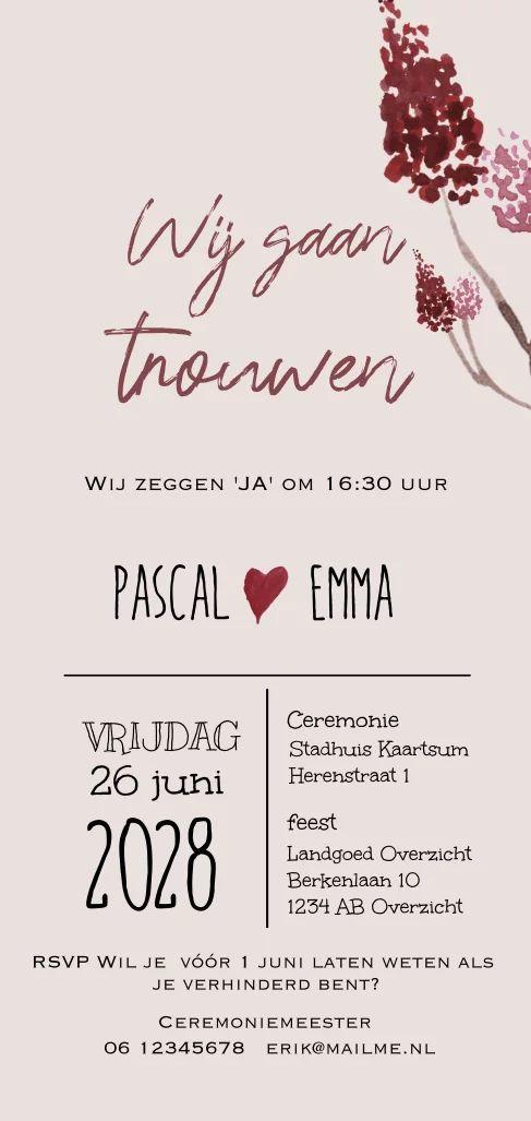 Moderne enkele trouwkaart met bloemen, vlakverdeling, hartje en losse teksten. Extra lang formaat 10x21cm