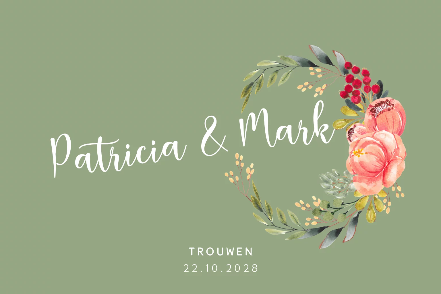 Opzoek naar een liggende romantic chic bloemen trouwkaart? Met groene en roze watercolor bloemen en grafische icoontjes. Zelf maken!