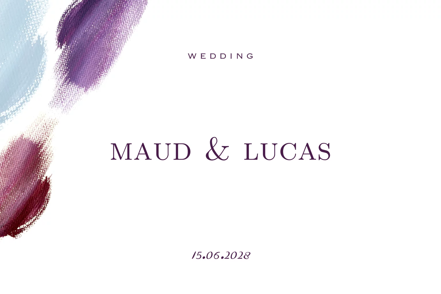 Opzoek naar een liggende moderne trouwkaart met verf strepen? Blauwe en paars gekleurde penseel brush in olieverf. Zelf maken!
