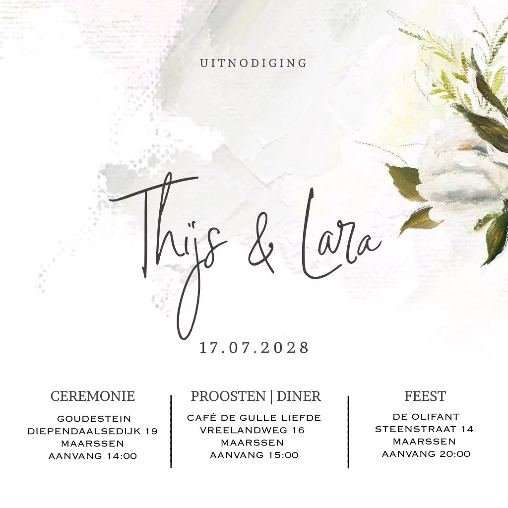 Unieke enkele vierkante trouwkaart met oil painting flowers en olieverf techniek op de ondergrond. Alles staat los en is te bewerken!
