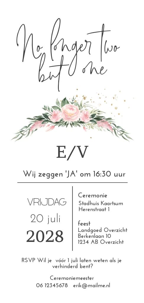 Prachtige trouwkaart met romantische roze bloemen en donker groen blad. Met romantische tekst en jullie initialen. Extra lang formaat 10x21cm. Alles staat los en is te bewerken.