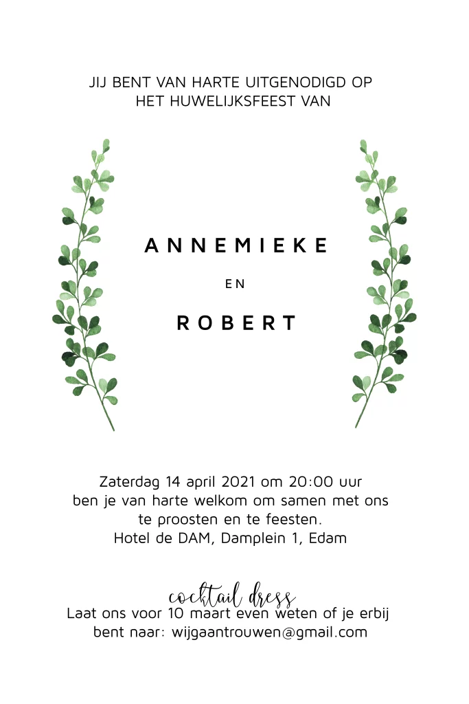 Prachtige uitnodiging voor jullie feest. Strak design met een botanische touch. Alles staat los en er zijn nog veel meer blaadjes in onze beeldbank. Probeer het uit!