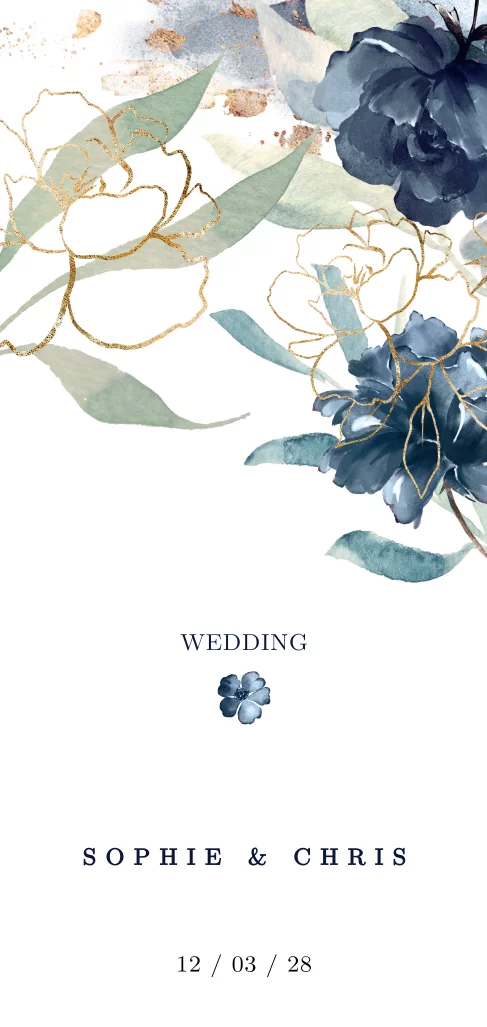 Prachtige trouwkaart met donkerblauwe bloemen, goudlook en bladeren. Alles is te bewerken.