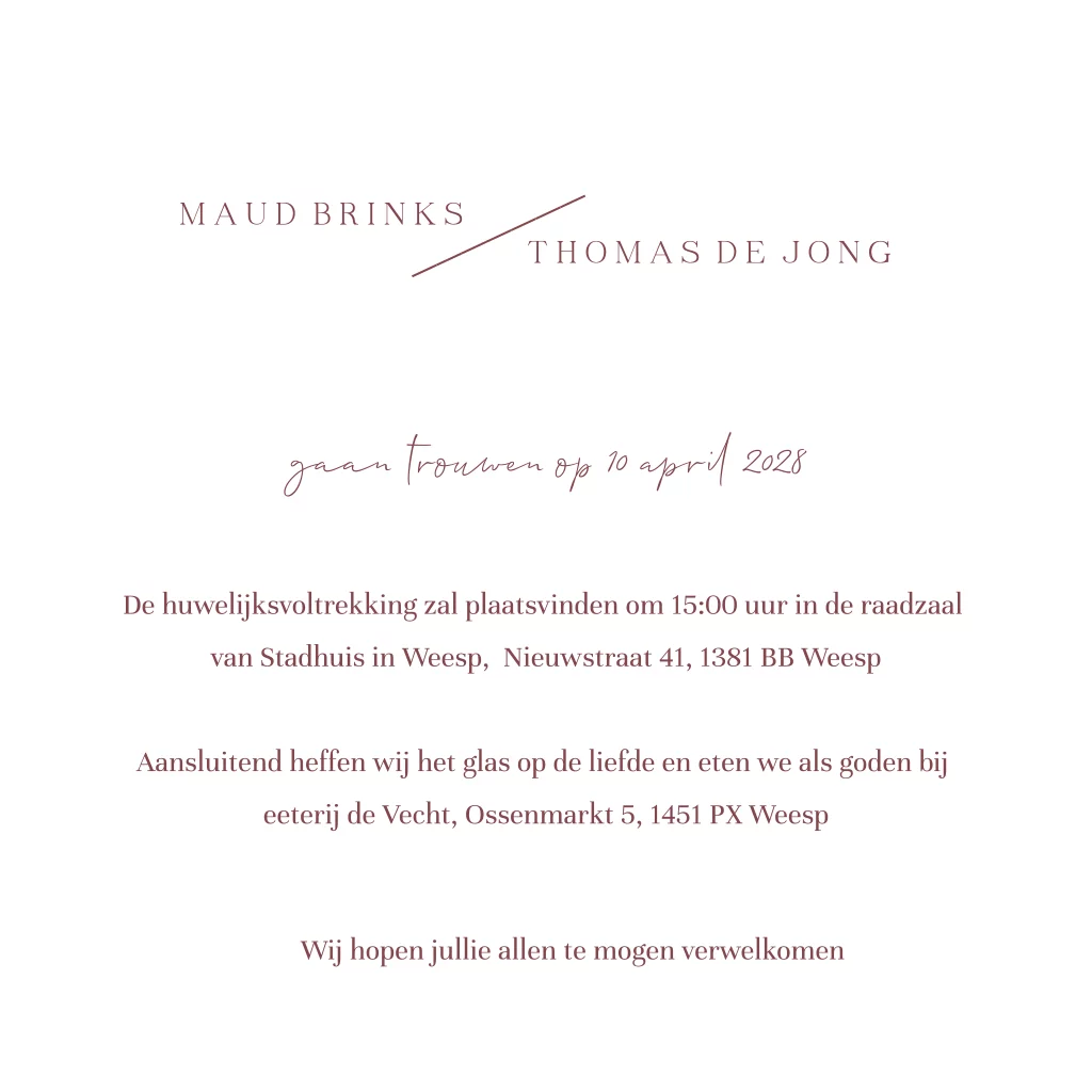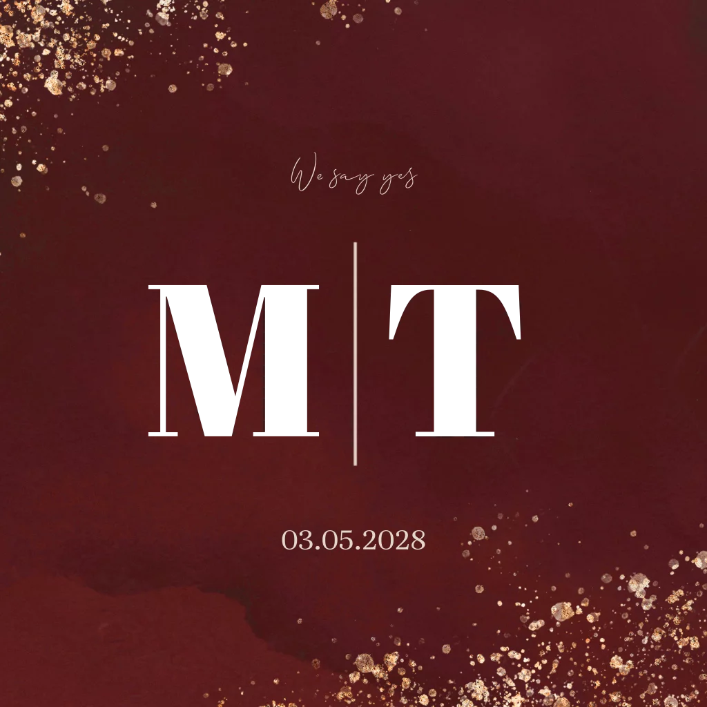 Mooie warm rode trouwkaart met goudfolie spetters.
