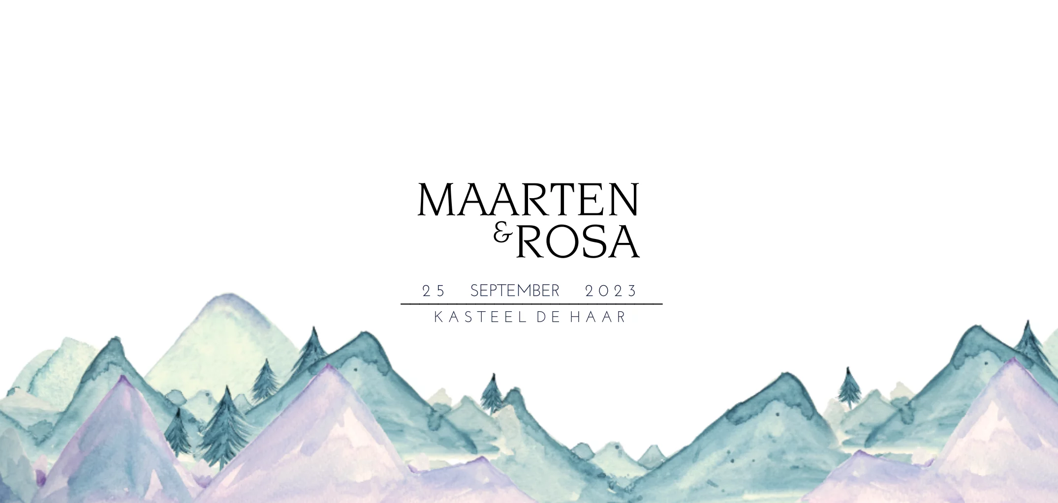 Dreamy Mountain trouwkaart met strak lettertype. Romantische watercolor bergen in groen en lila pastel kleuren. Alles staat los en is te bewerken. Andere afbeeldingen in dezelfde stijl gebruiken? Ga in onze editor naar 'Afbeeldingen en versieringen' en kies 'Dreamy Mountains'