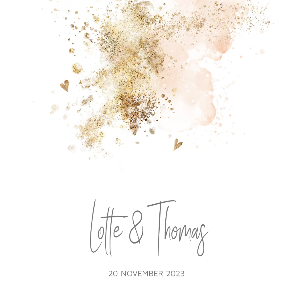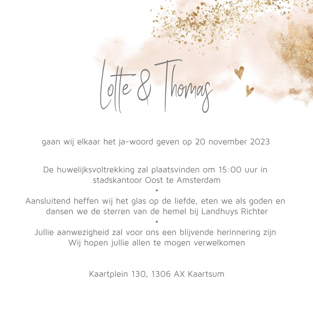Opzoek naar een trendy trouwkaart? Trouwkaart met aquarel en goud look poeder effect. Alles staat los en is te bewerken.