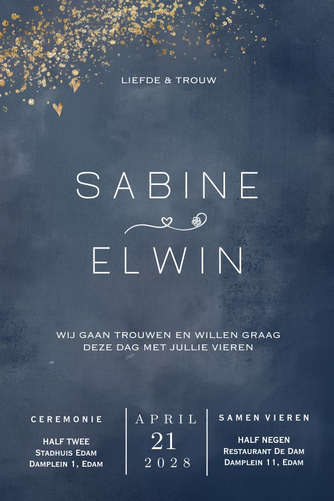 Opzoek naar een moderne trouwkaart in het donkerblauw? Met watercolor brush afbeelding. Zelf maken!