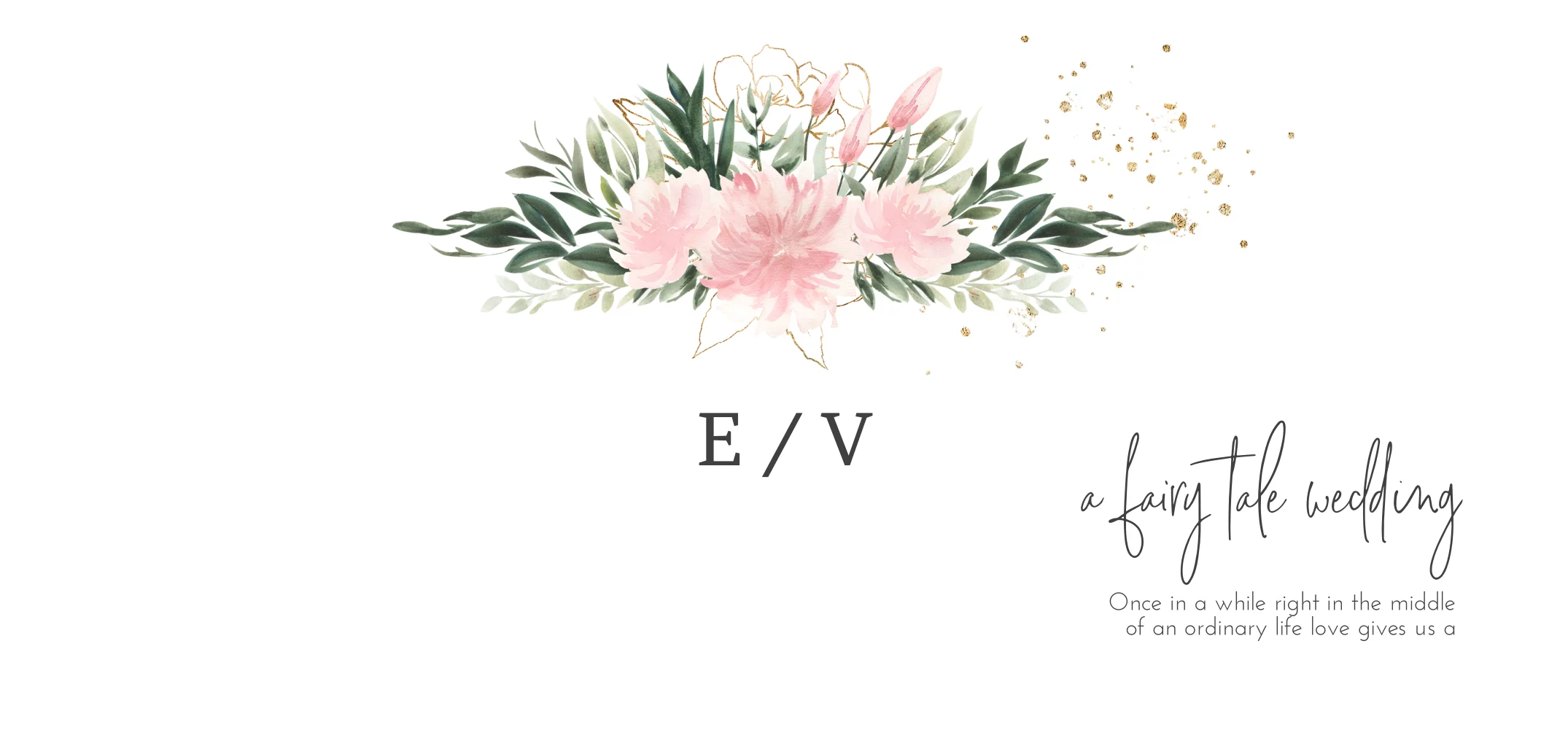 Uitnodiging voor 'a fairy tale wedding' versierd met jullie eigen initialen een prachtig liefdesgedicht en pastelroze bloemen en donker groen blad. Alles staat los en is aan te passen.