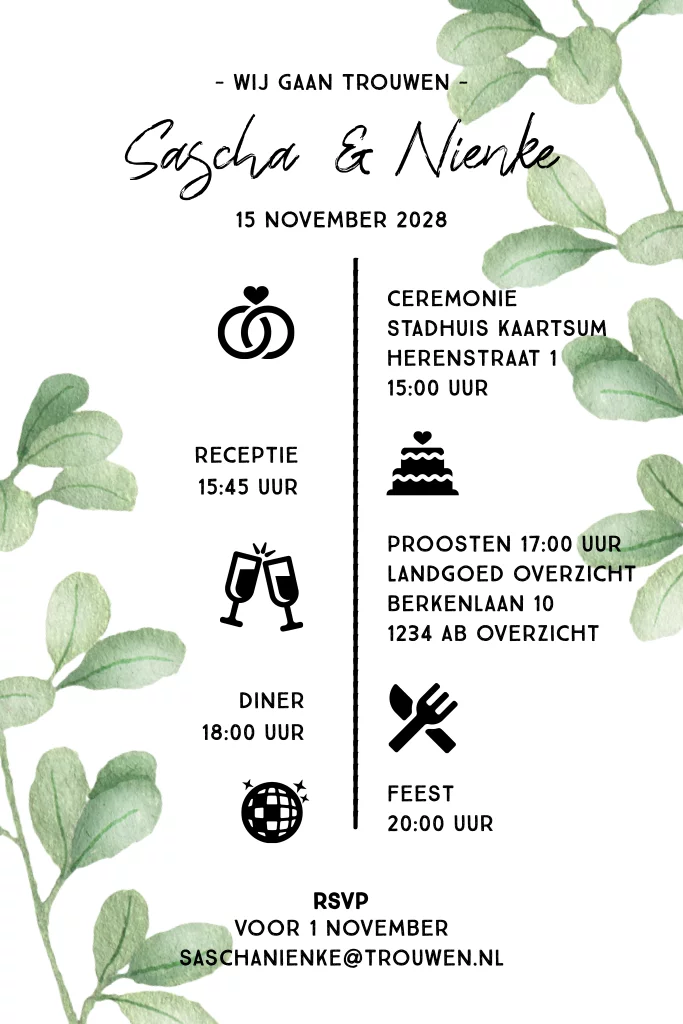 Unieke trouwkaart met botanisch look van hangende groene takjes met blad, hippe trouw icoontjes en sierletters. Alles staat los en is te bewerken. Zelf maken!