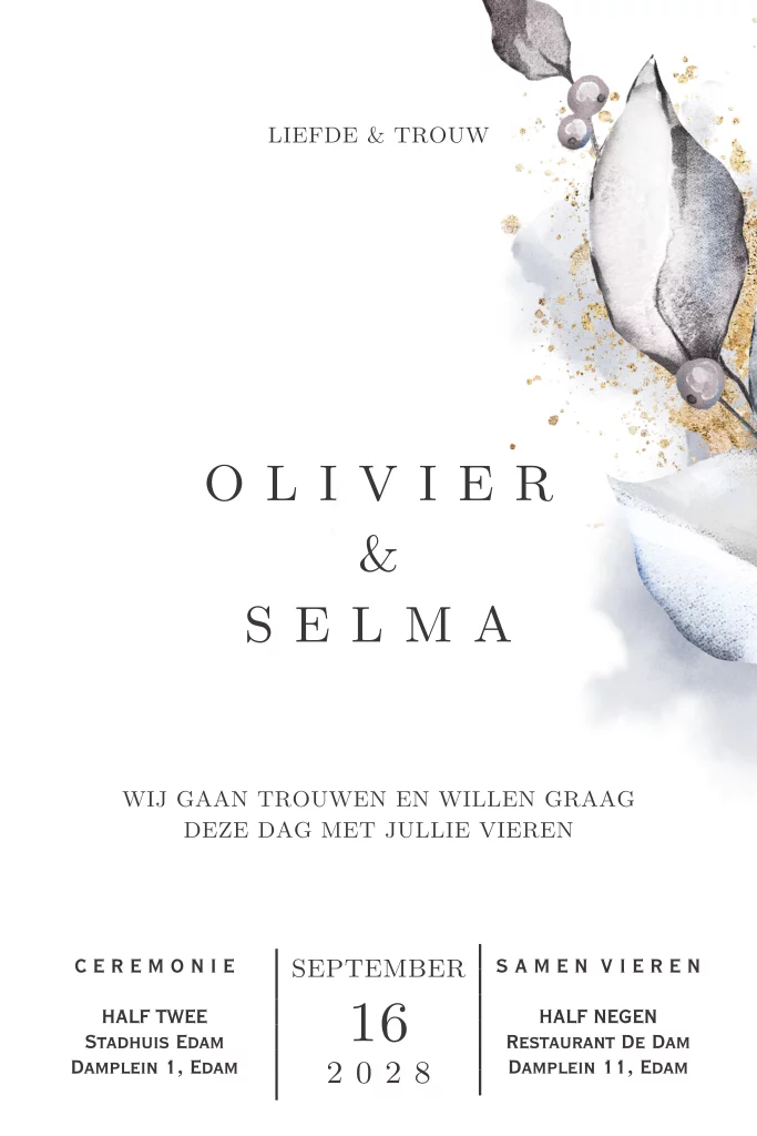 Sunset flowers trouwkaart met lila / paars watercolor bladeren en spetters in goud poeder look (geen echt goud). Zelf maken.