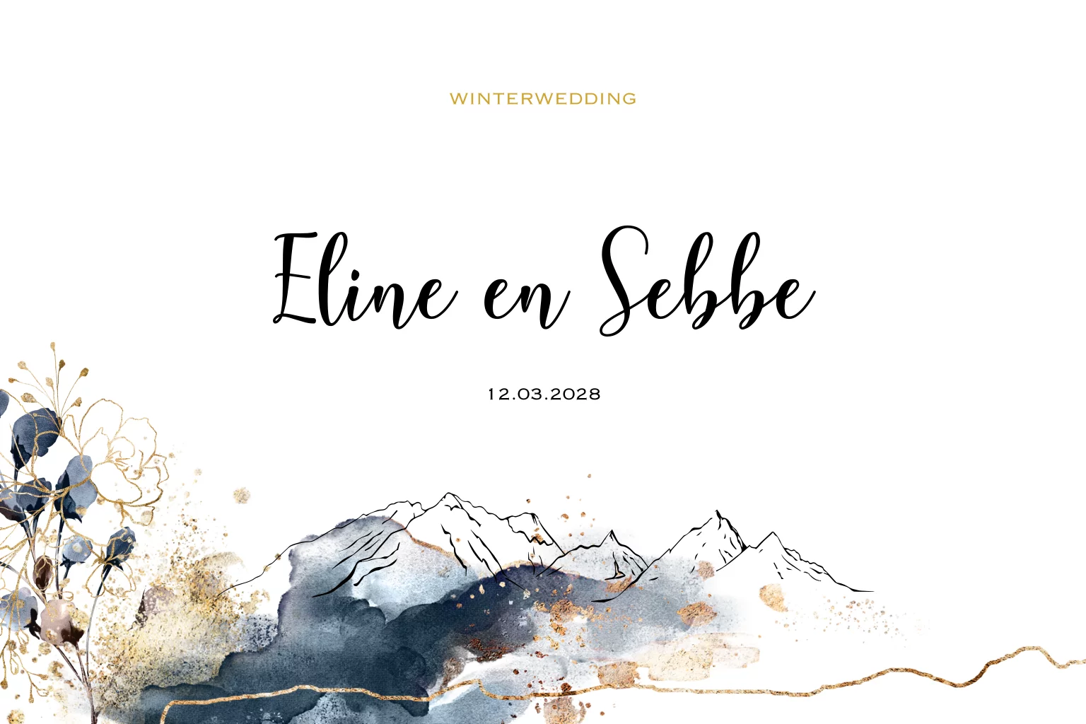 Winterse dubbele klapkaart trouwkaart met prachtige donker blauwe watercolor verf brush met spetters in goudlook en mountains. Huisstijl Dreamy Mountain. Alles staat los en is zelf te bewerken.
