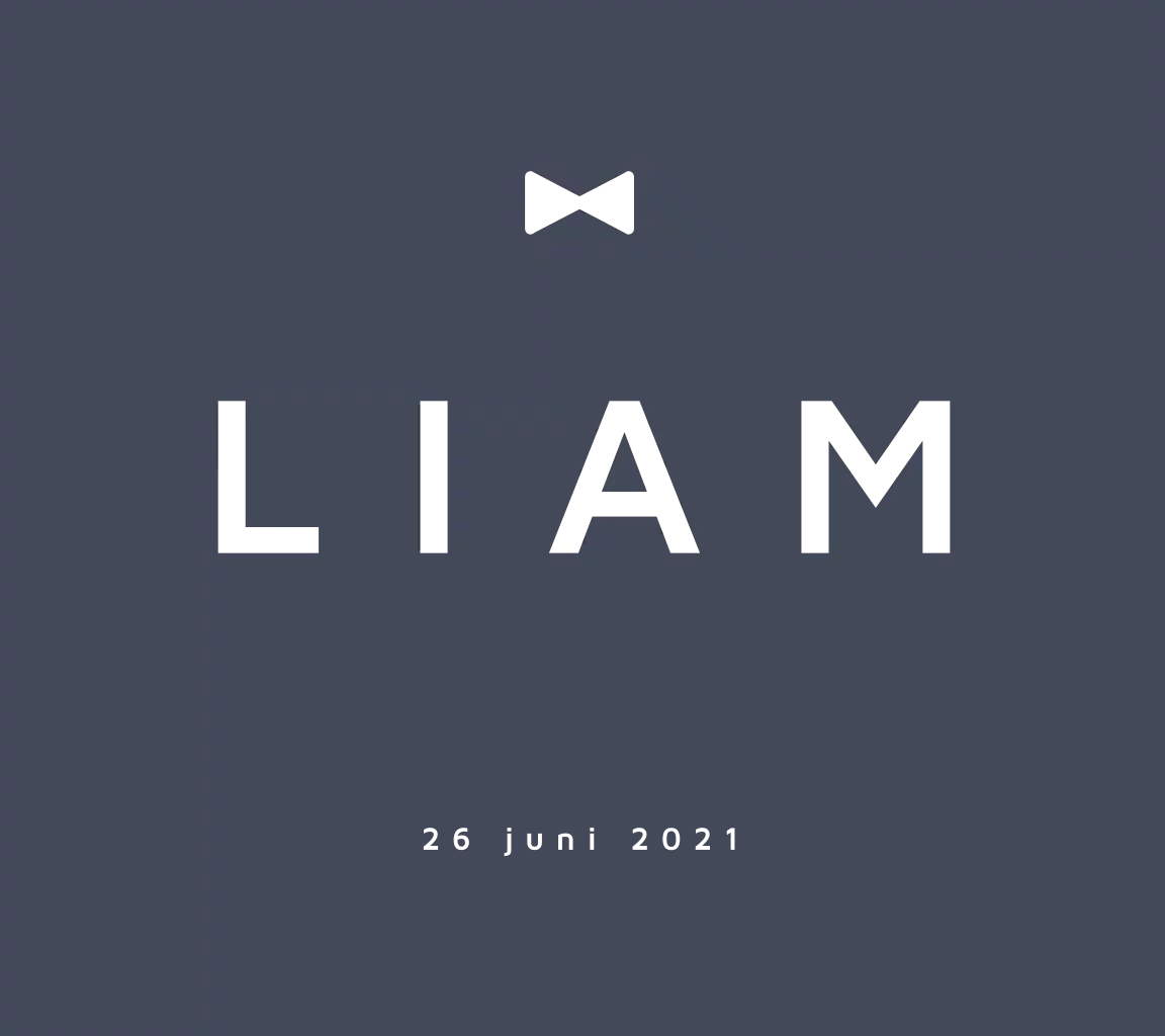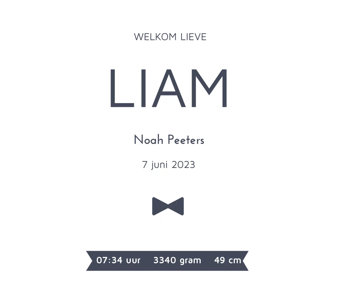 Formaat voor onze Belgische klanten. Strak donkerblauw ontwerp met strik en naam in écht goudfolie. Koper- en zilverfolie zijn ook mogelijk.