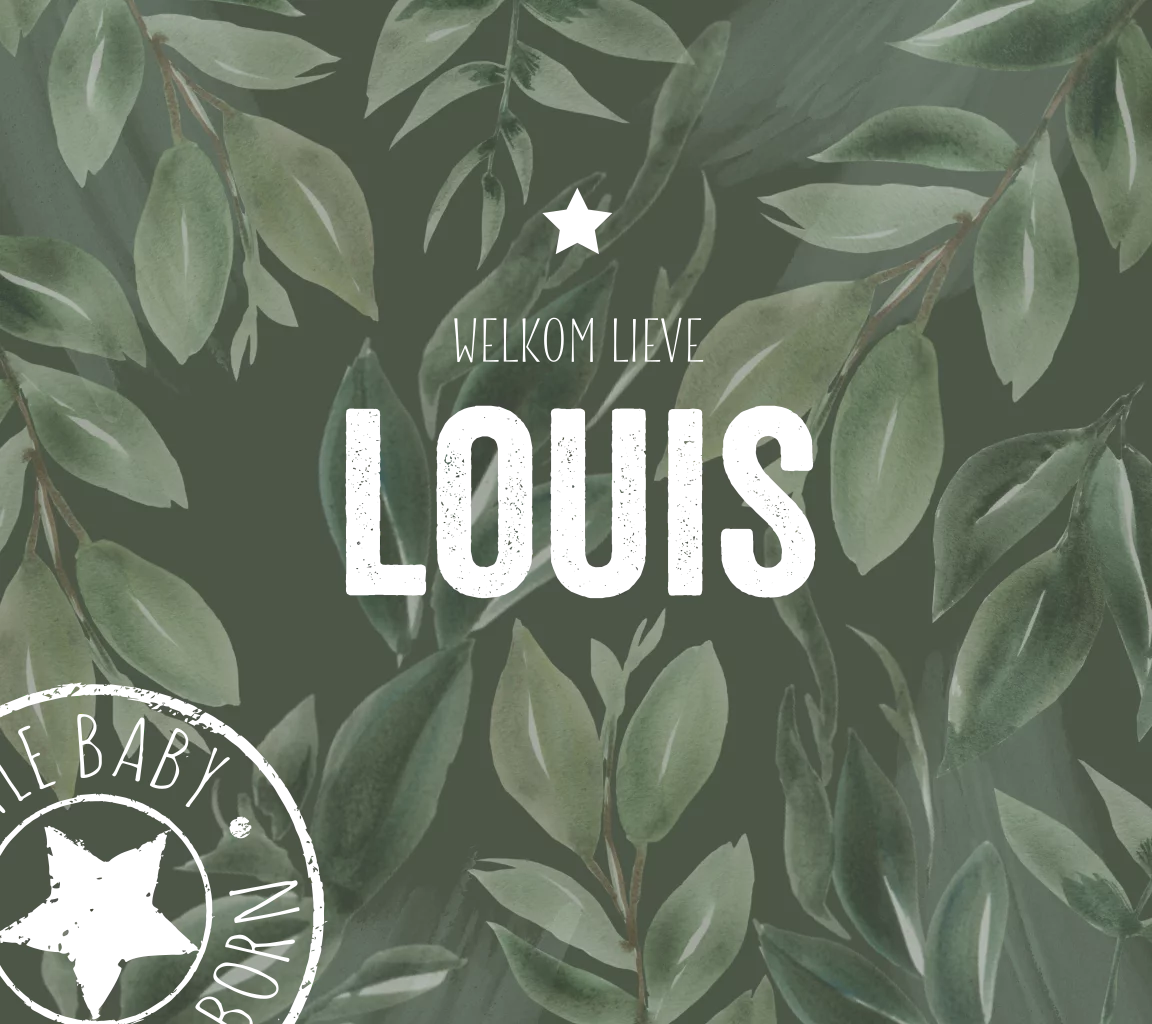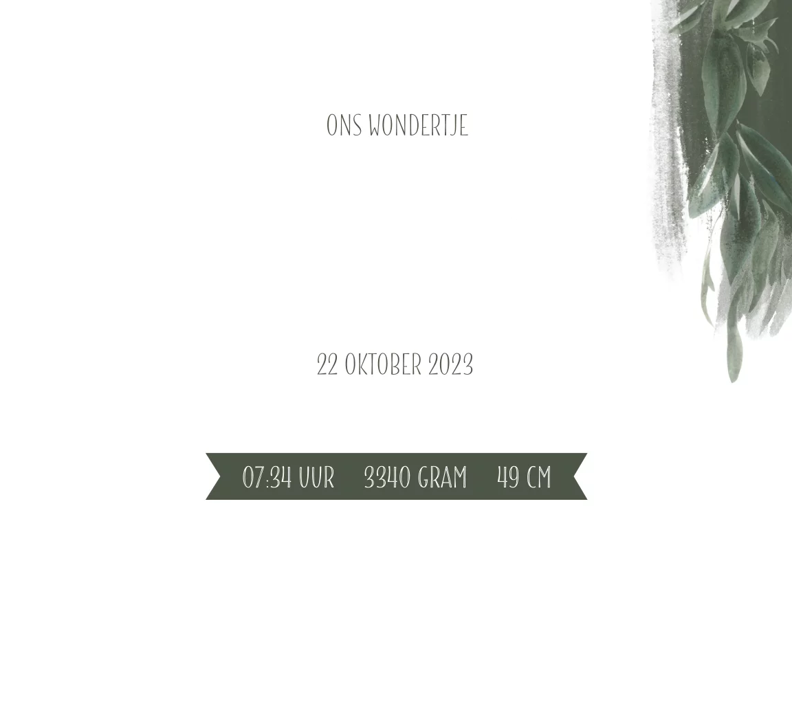 Speels geboortekaartje in Belgisch vierkant formaat voor een jongen met een jungle look, Donker groene bladeren met goudfolie tekst, ster en stempel. Zelf maken!