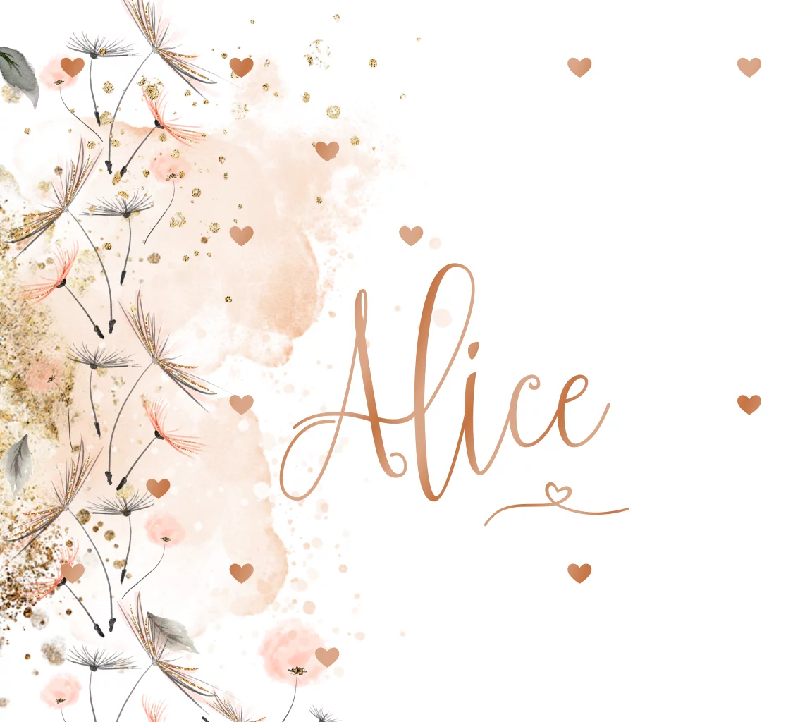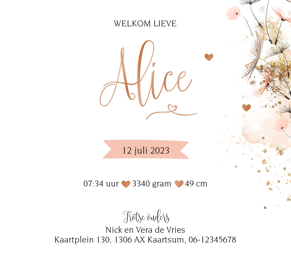 Belgisch vierkant geboortekaartje voor een meisje met getekende paardenbloemen en veel hartjes. Romantisch kaartje met hartjes en naam gedrukt in écht koperfolie. Zelf maken!