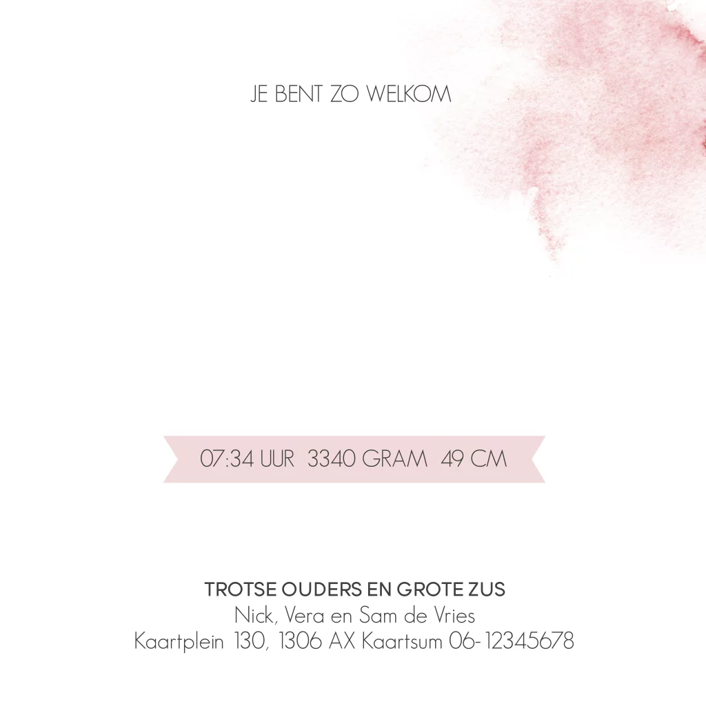 Uniek vierkant geboortekaartje voor een zusje! Met zachte roze waterverf effect en voorzien van écht goudfolie druk aan alle zijdes van de kaart. Met klein goud hartje.