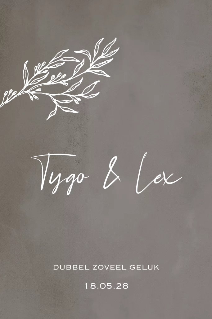 Stijlvolle staand geboortekaartje voor een tweeling jongens. Met mooie outline takjes en teksten in écht foliedruk gedrukt. Zelf maken!
