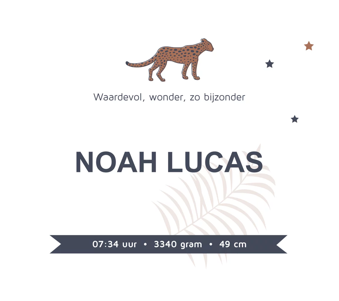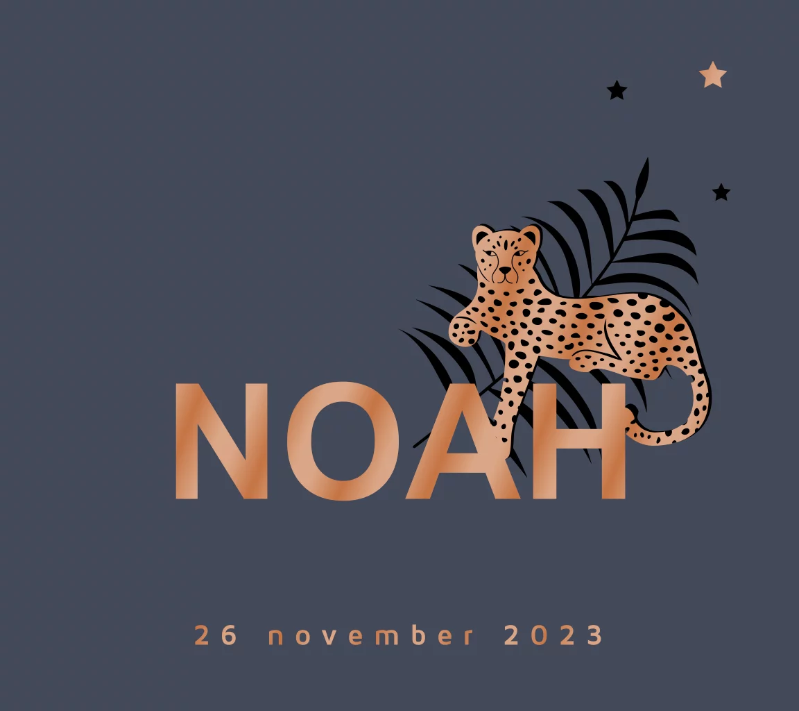 Belgisch vierkant jungle geboortekaartje voor een jongen met tekst en luipaard in écht koperfolie gedrukt. Enkelzijdig koperfolie. De ondergrond is nu donkerblauw, maar kan jezelf aanpassen. Zelf maken. Ook mogelijk in goud- en zilverfolie druk.