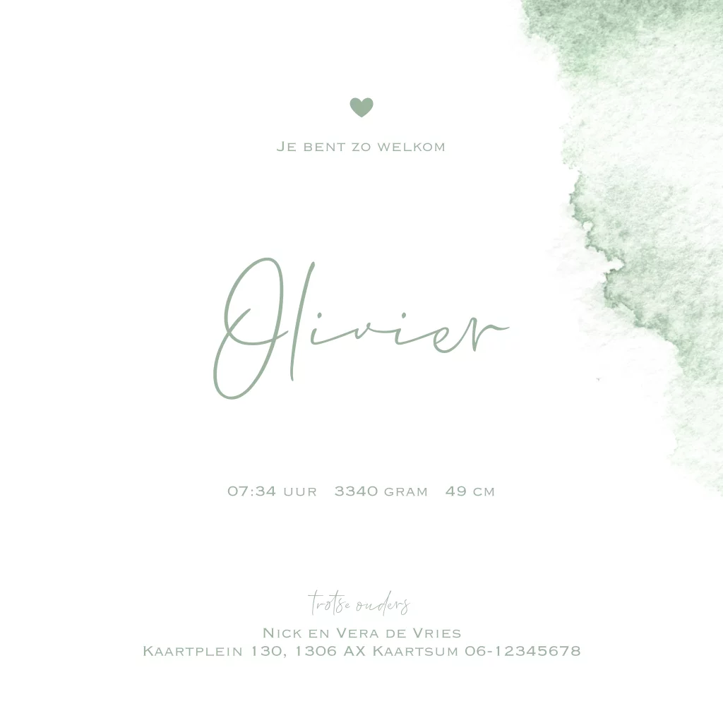 Lief dubbel geboortekaartje voor een jongen! Met licht groene waterverf brush effect en de buitenzijde is nu voorzien van écht foliedruk. Zelf maken!