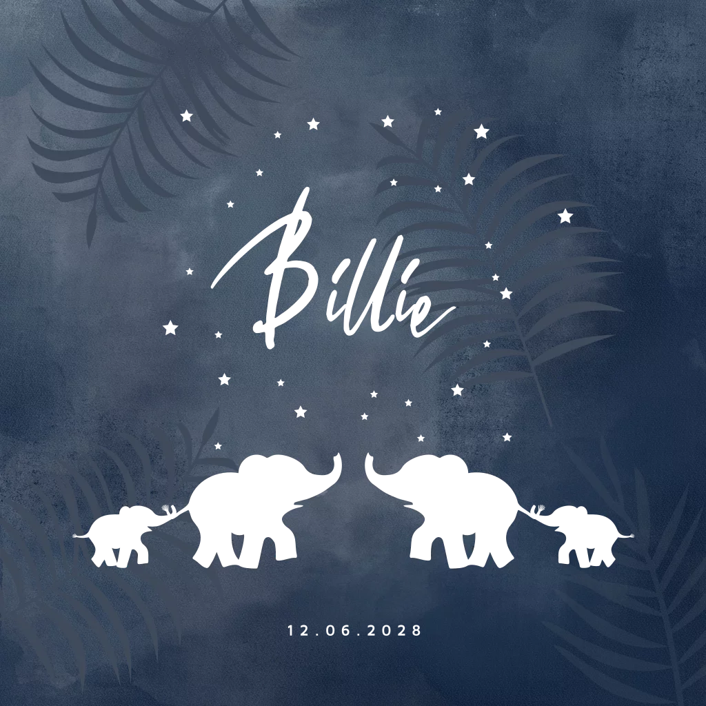 Stijlvol geboortekaartje met silhouet van baby olifant familie. De achtergond heeft een donkerblauwe watercolor brush. Met écht goudfolie op de voor- en achterzijde. Ook mogelijk in andere folie kleuren.