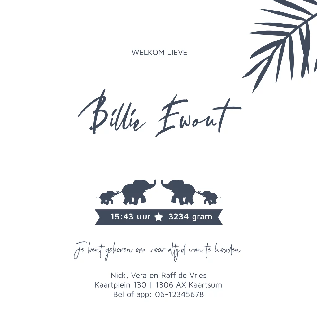 Stijlvol geboortekaartje met silhouet van baby olifant familie