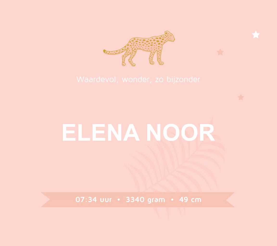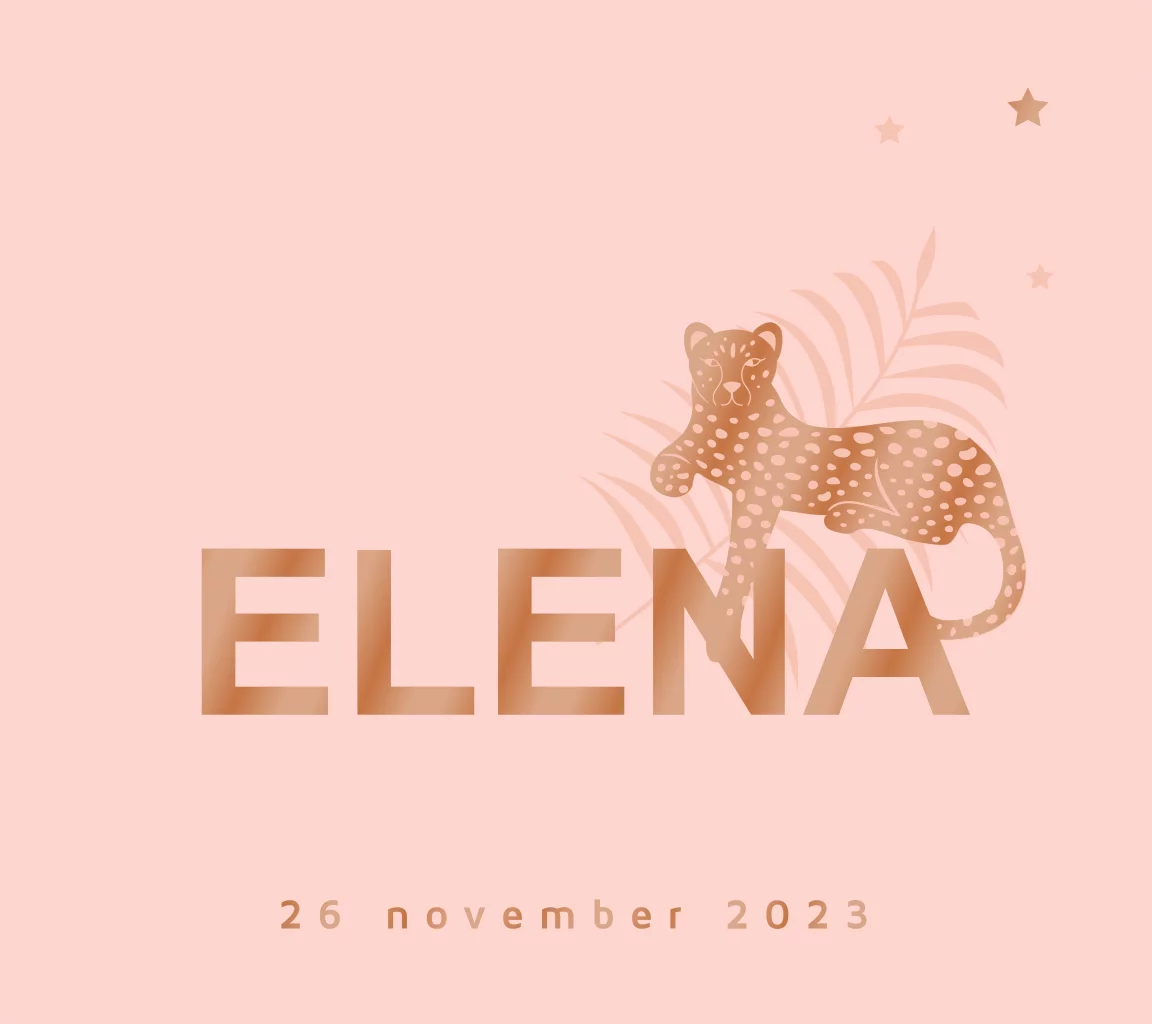 Belgisch vierkant jungle geboortekaartje voor een mneisje met tekst en luipaard in écht koperfolie gedrukt. Enkelzijdig koperfolie. De ondergrond is nu zacht roze, maar kan jezelf aanpassen. Zelf maken. Ook mogelijk in goud- en zilverfolie druk.