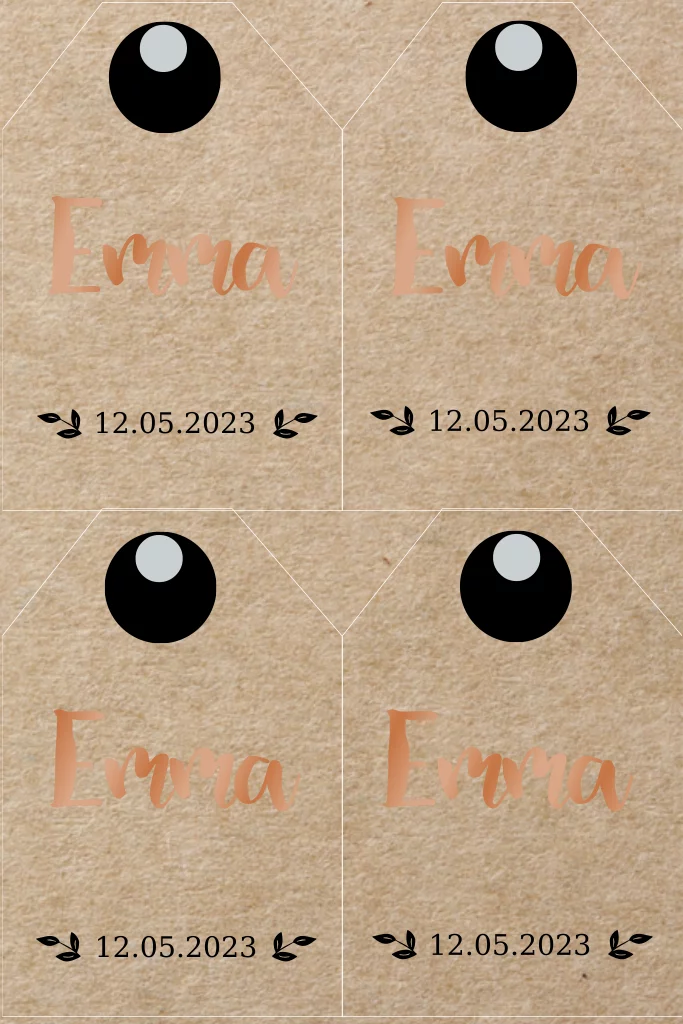 Pimp je geboortekaartje met dit leuke DIY labeltje! Met naam en geboortedatum in zwart en écht koperfolie druk op een kraft look ondergrond.