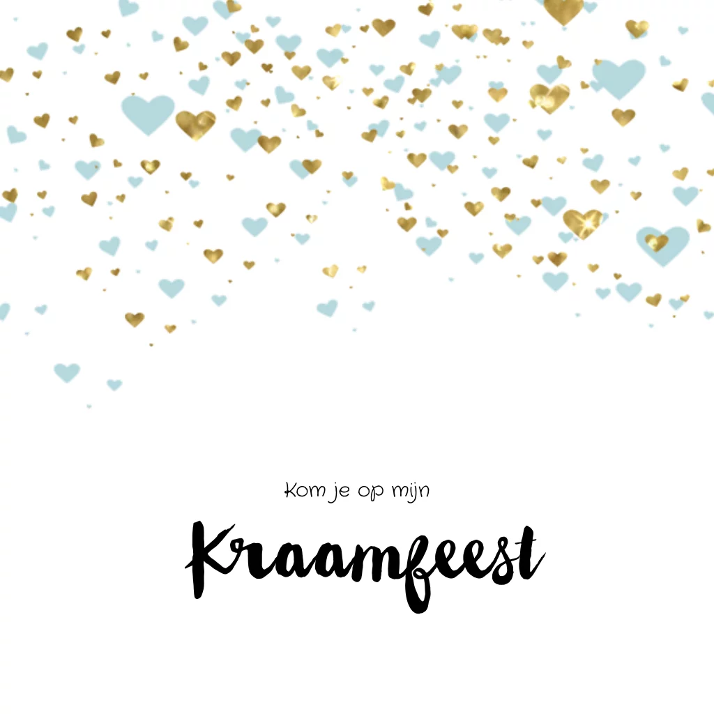 Sweet kraamfeest kaartje met patel blauwe hartjes design op de ondergrond. Goud gekleurde hartjes op de voorzijde! Zelf maken!