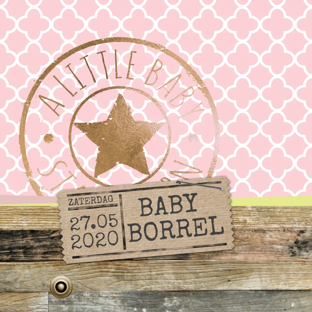 Uniek meisjes babyborrelkaart met hout, sterren en stempel