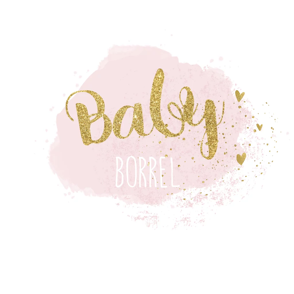 Romantisch en rustig kraamfeest kaartje voor een meisje? Met speelse hartjes, spetters en goudkleurige tekst. Alles staat los op dit kaartje en is aan te passen!
