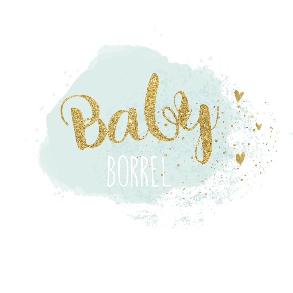 Romantisch en rustig kraamfeest kaartje voor een jongen? Met speelse hartjes, spetters, wolk en goudkleurige letters! Alles staat los op dit kaartje en is aan te passen!