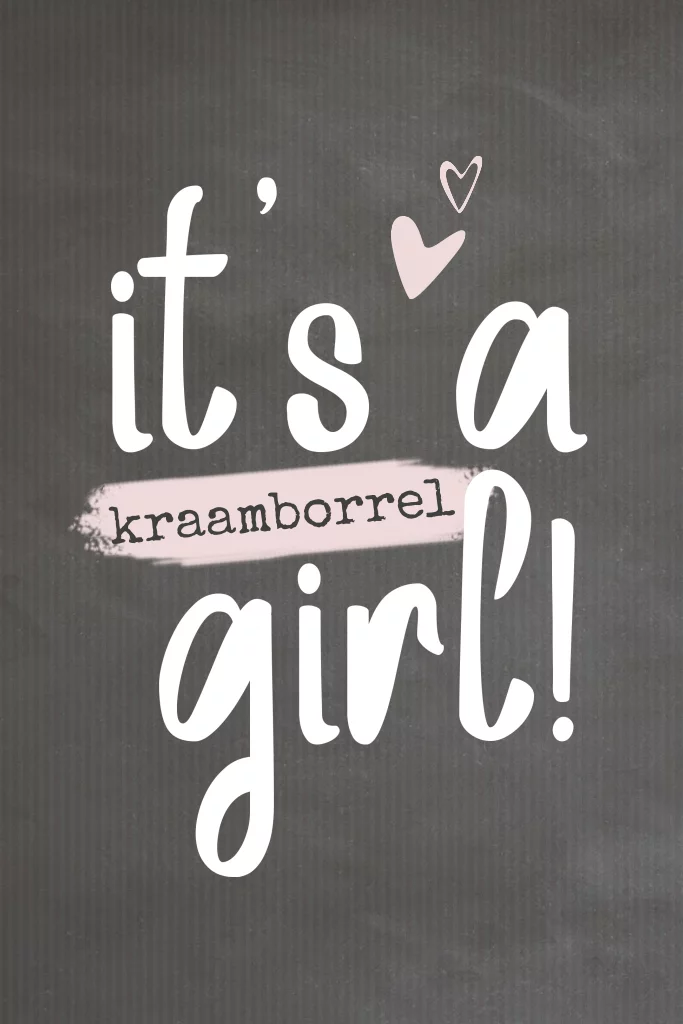 Enkel staande krijtbord uitnodiging voor een kraamborrelfeest meisje. Met een vleugje roze, hartjes en it's a girl versje in hand lettering.