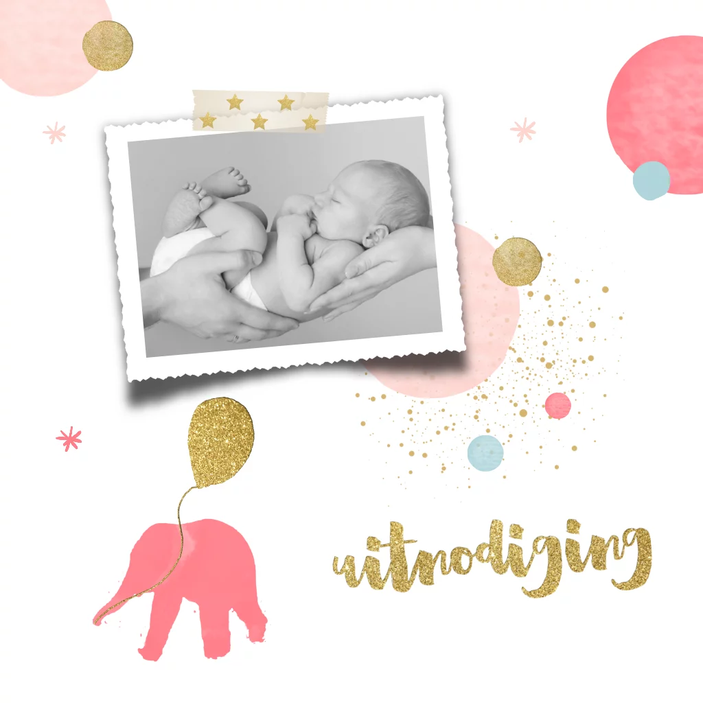 Hip foto kraamborrel kaartje met lief olifantje. voor een meisje! Met goud look elementjes zoals; ballon, plakband en confetti. Alles is zelf aanpassen! Ook de kleur!