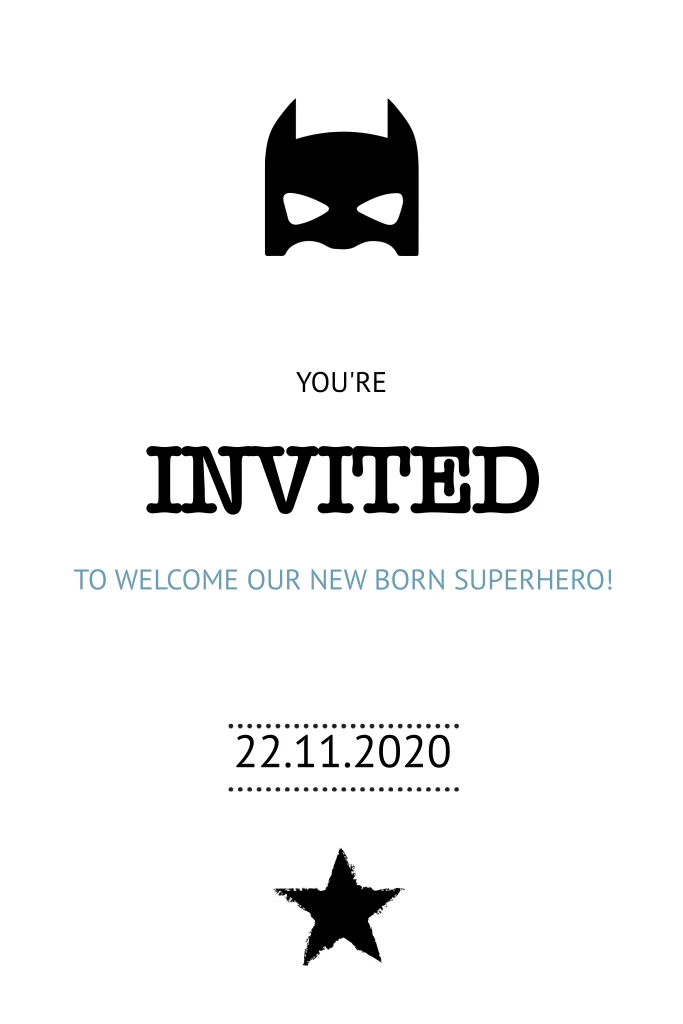 Gaaf enkel babyborrelkaartje voor een jongen in het zwart wit. Strak design met hero masker en sster. Alles is te bewerken!