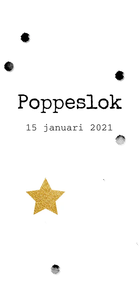 Clean uitnodiging voor poppeslok - kraamfeest voor een jongen met zwarte confetti dots, wolk label met plakband en ster met goud folie structuur look.